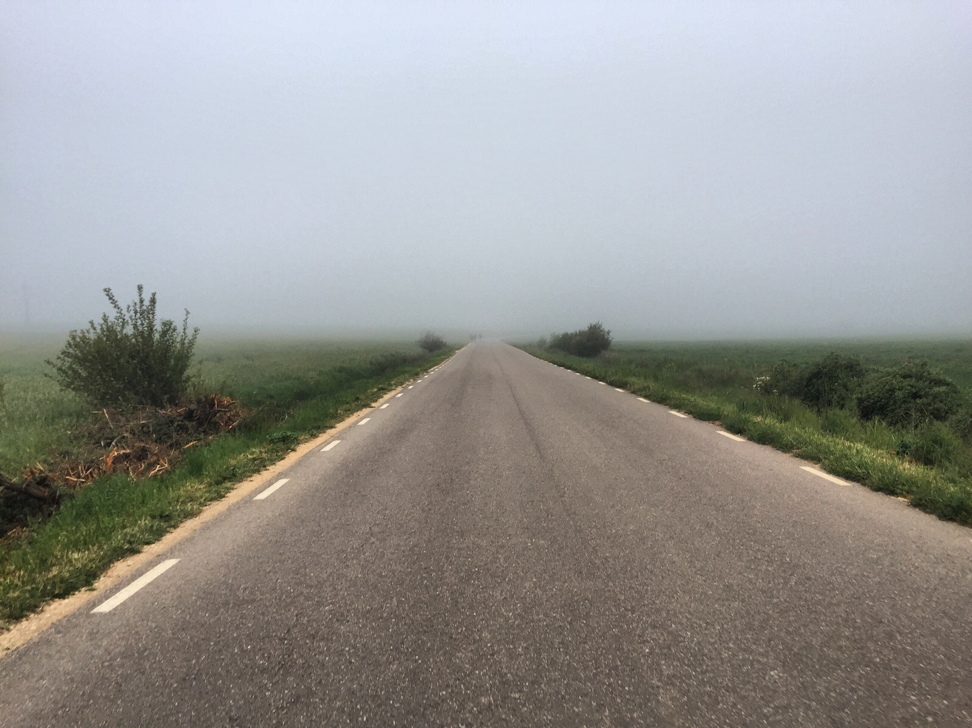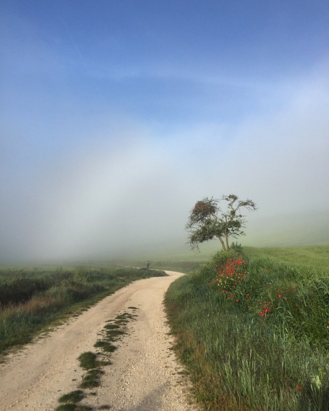 Anyway, today has been a good day. I slept well last night and had a “lazy” morning – didn’t get on the road until 7am. The fog was very thick for the first hour when we walked through a cute village and up over a mountain.