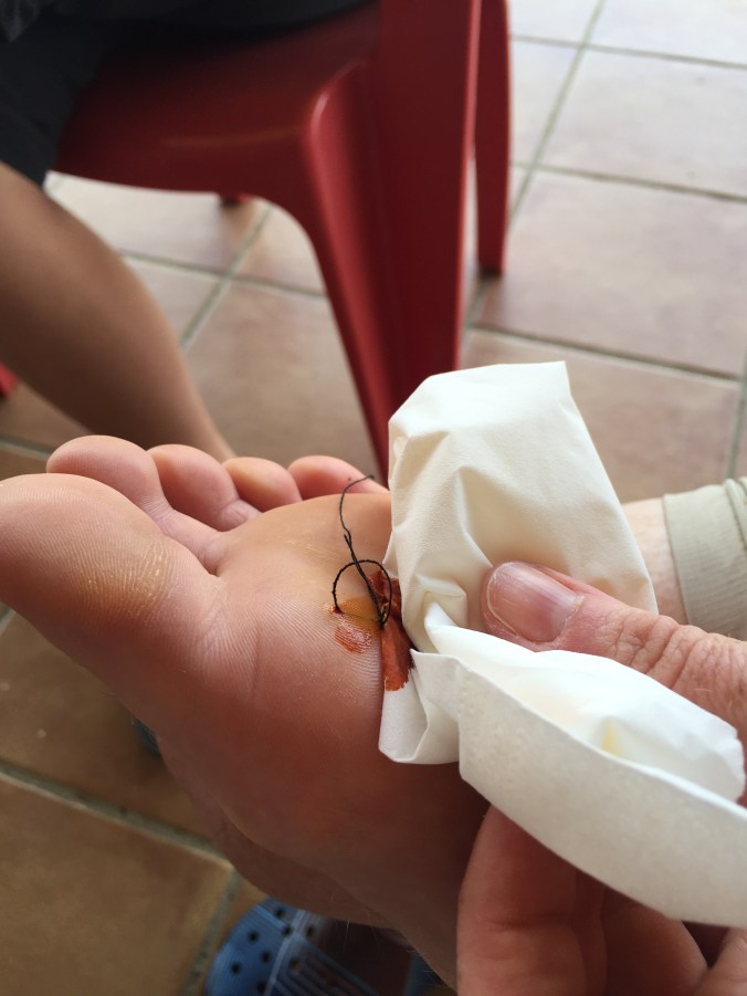 But wait, something exciting did just happen! As I’m sitting here writing this with three other women I met on my first evening in St. Jean, Kate is performing “surgery” on her blister. There’s always a great debate on how to treat them. Compeed is what some swear by, but others like the needle and thread approach. Eva has become very knowledgable on both methods with her blisters so she just walked Kate through the experience. Sorry if the image below is too graphic but I think sharing all aspects of the Camino are important. đ