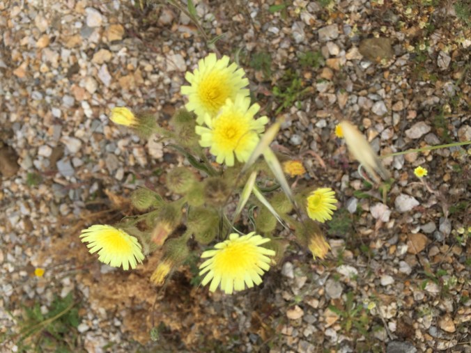 I see farm fields to the left and farm fields to the right. It’s super exciting when there’s something slightly different to see. Oh look! A flower. Ok, maybe it’s just a weed, but it’s pretty.