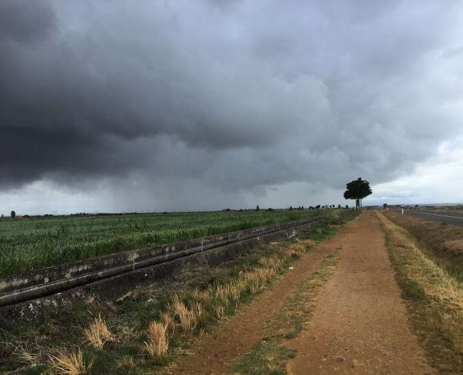 Today’s walk was not very exciting as a good chunk of it was just leaving Leon and its suburbs. There were sections where we had to walk on the highway with big semi trucks passing by. The rain started and then went. Then it started again in a big way. Along with thunderstorms and wind.