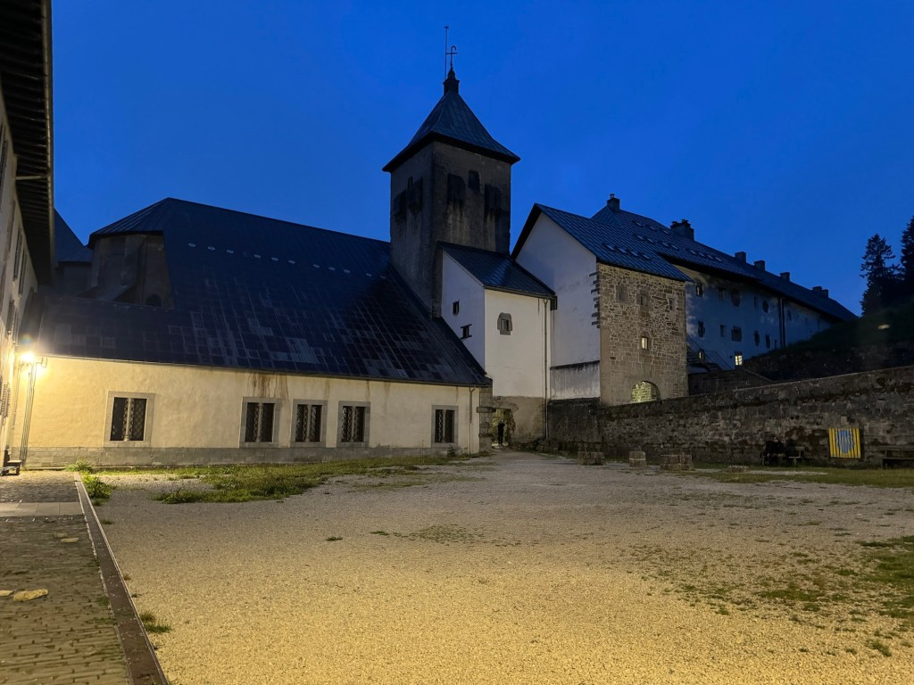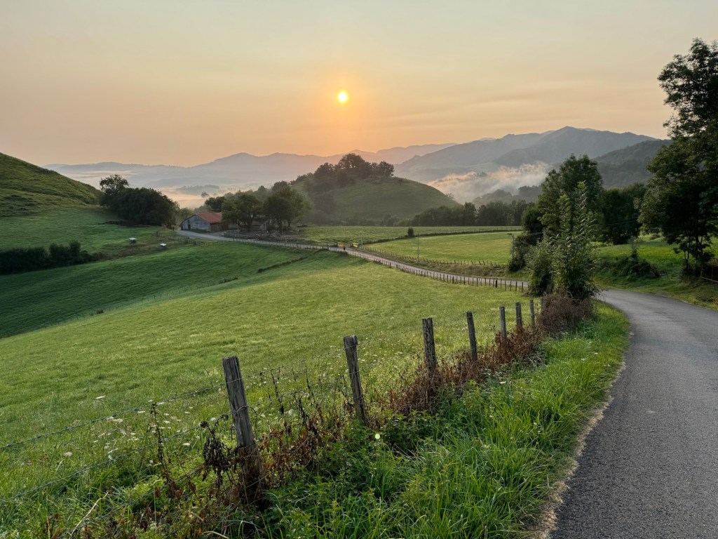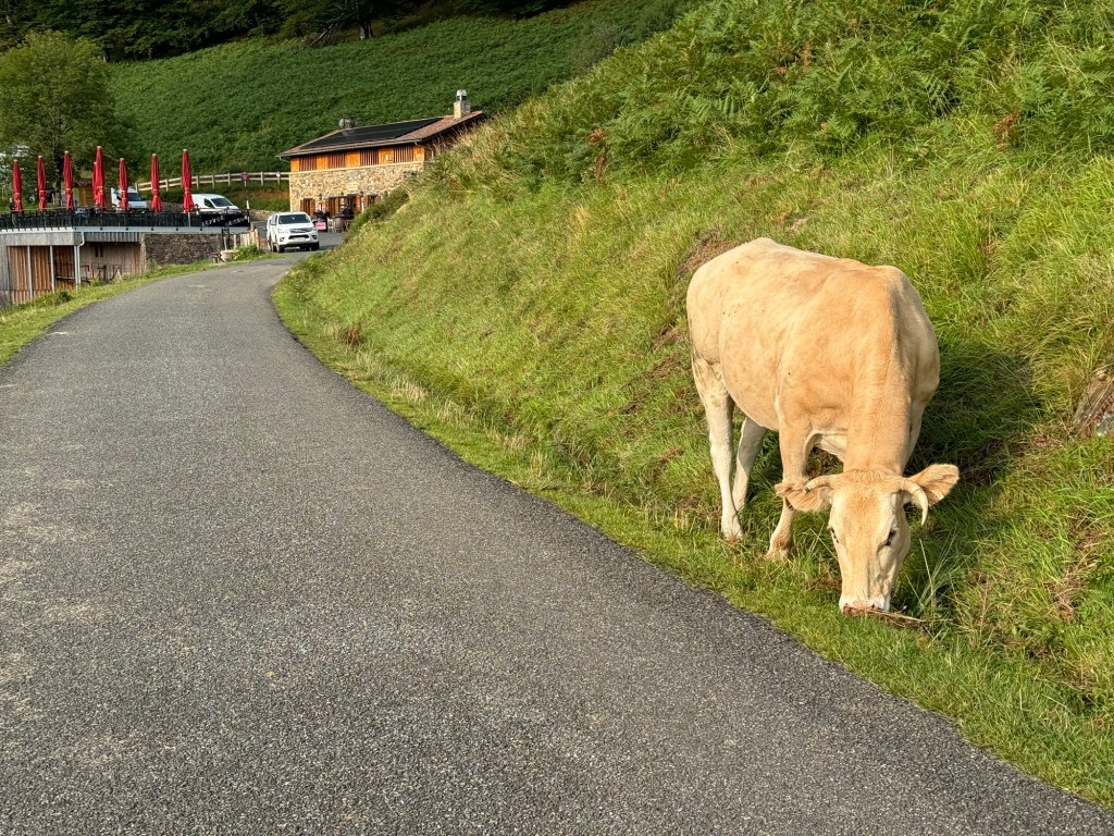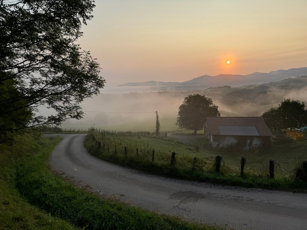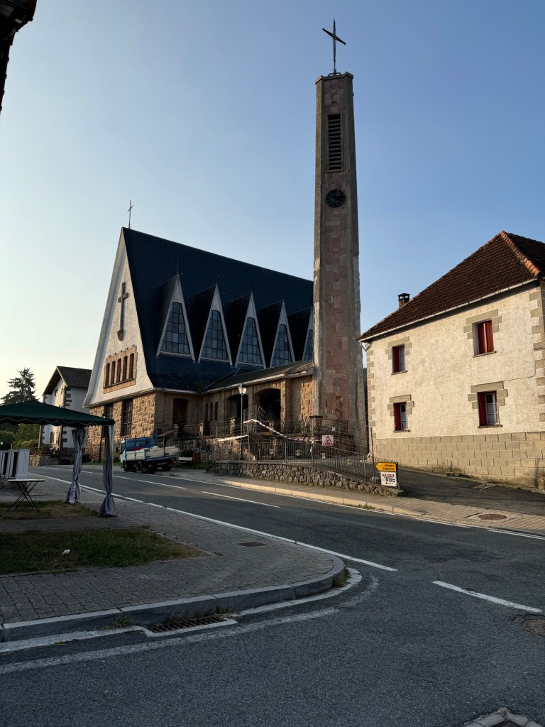 Walking this late in the summer means shorter days – so starting in the dark. It was the absolute perfect temperature when I left Roncesvalles today. A nice easy walk through a beautiful forest. The sun started to rise when I got to some openings with cattle fields. Through some bushes I could see a mother cow and her brand new baby cow – guessing it was born over night. It was so cute! Wish mama wasn’t keeping the baby cow so hidden so I could have gotten some photos.