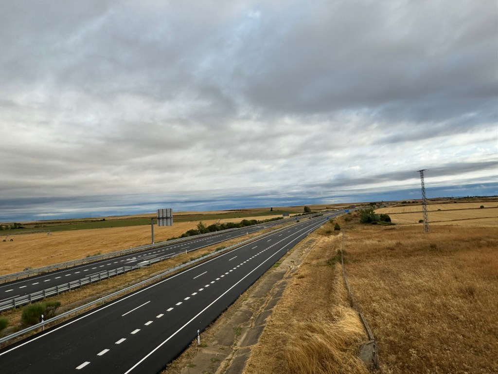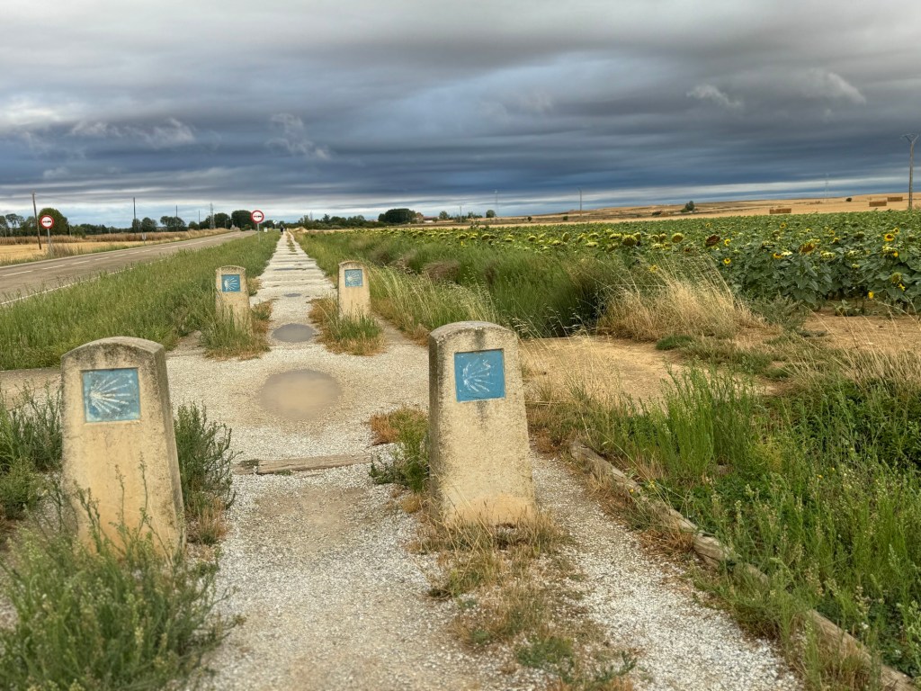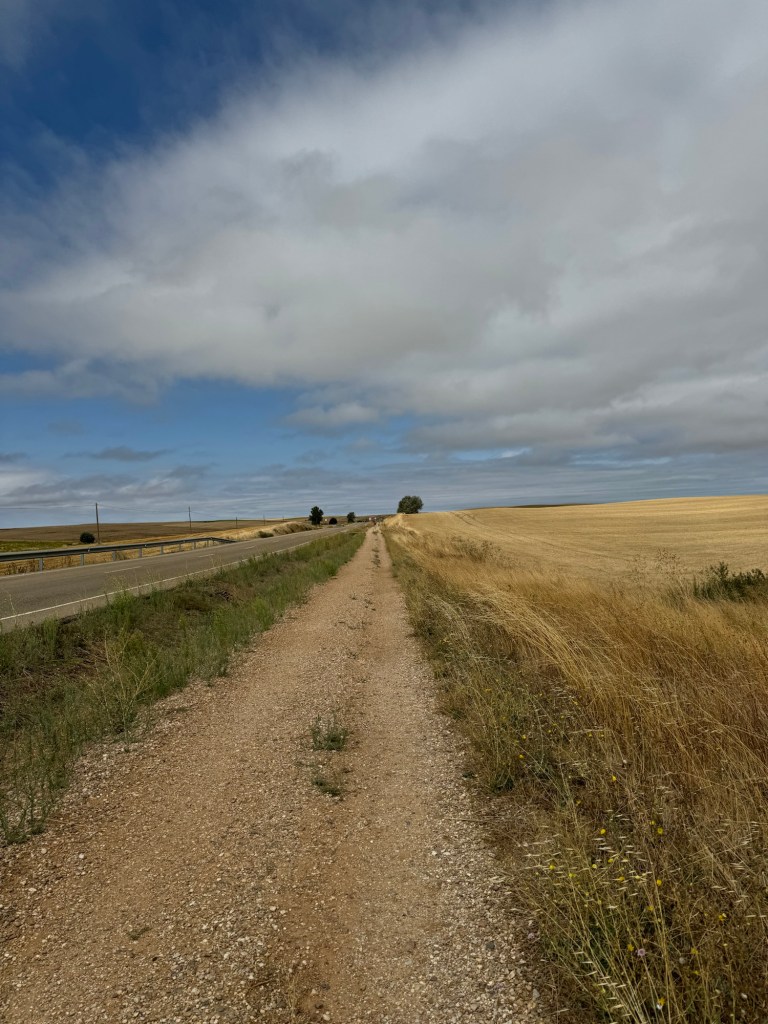 Today’s Camino day is probably one of the easiest and most straightforward days there is. The views are similar most of the way with flat or only slightly rolling farm fields. There was an option to take a more scenic route for part of the day that was about a kilometer farther than just following the roadside path. I had done the scenic route last time so I opted to save the extra walking and see what the other route was like. Going that way meant I ran into a couple Camino friends at one break. They had left early enough to get stuck in the storm so they were trying to dry their stuff out.